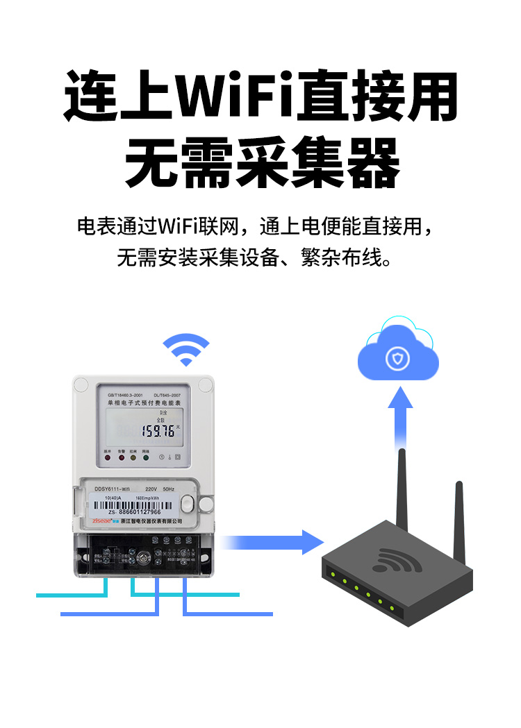 這種抄表方式在青年公寓,白領公寓,酒店式公寓采用比較多,這種方式直接聯上公寓里的wifi上遠抄服務器,再通過電腦診斷或手機app就能直接使用,這種智能電表使用量不大的情況下,用戶可自行采購安裝,WiFi電表安裝簡單方便,圖如下:
