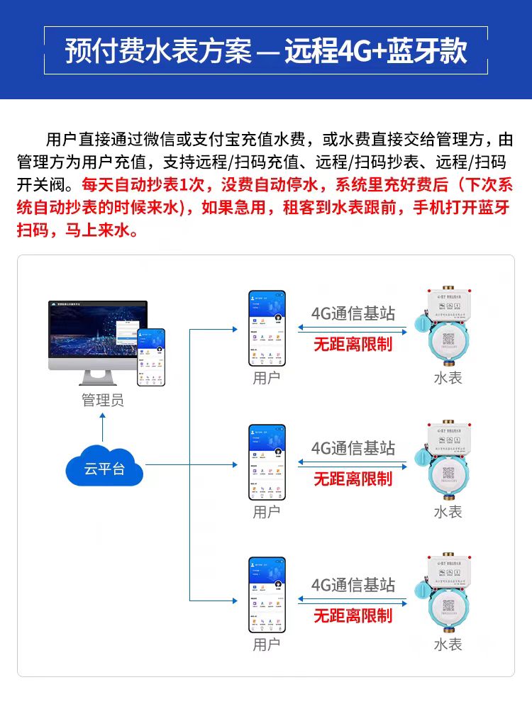 4G無線閥控預付費智能水表是-種預付費的水費管理模式,用戶需要預先充值才能使用水資源,這種功能的實現不僅提高了水費收取的效率,還減少了欠費和催繳的問題,以下是4G無線閥控智能水表預付費功能的實現原理: