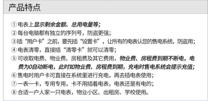 主要特點:應用計算機管理,先購電后用電;在額定電流范圍內能限制使用功率(由供電部門限定);一表一卡,專卡專用,失卡不失電,補卡再用;電卡能雙向傳遞數據,能自動斷電告警用戶購電;電量為零時,自動拉閘斷電;并具有一定的防竊電軟件設計等。